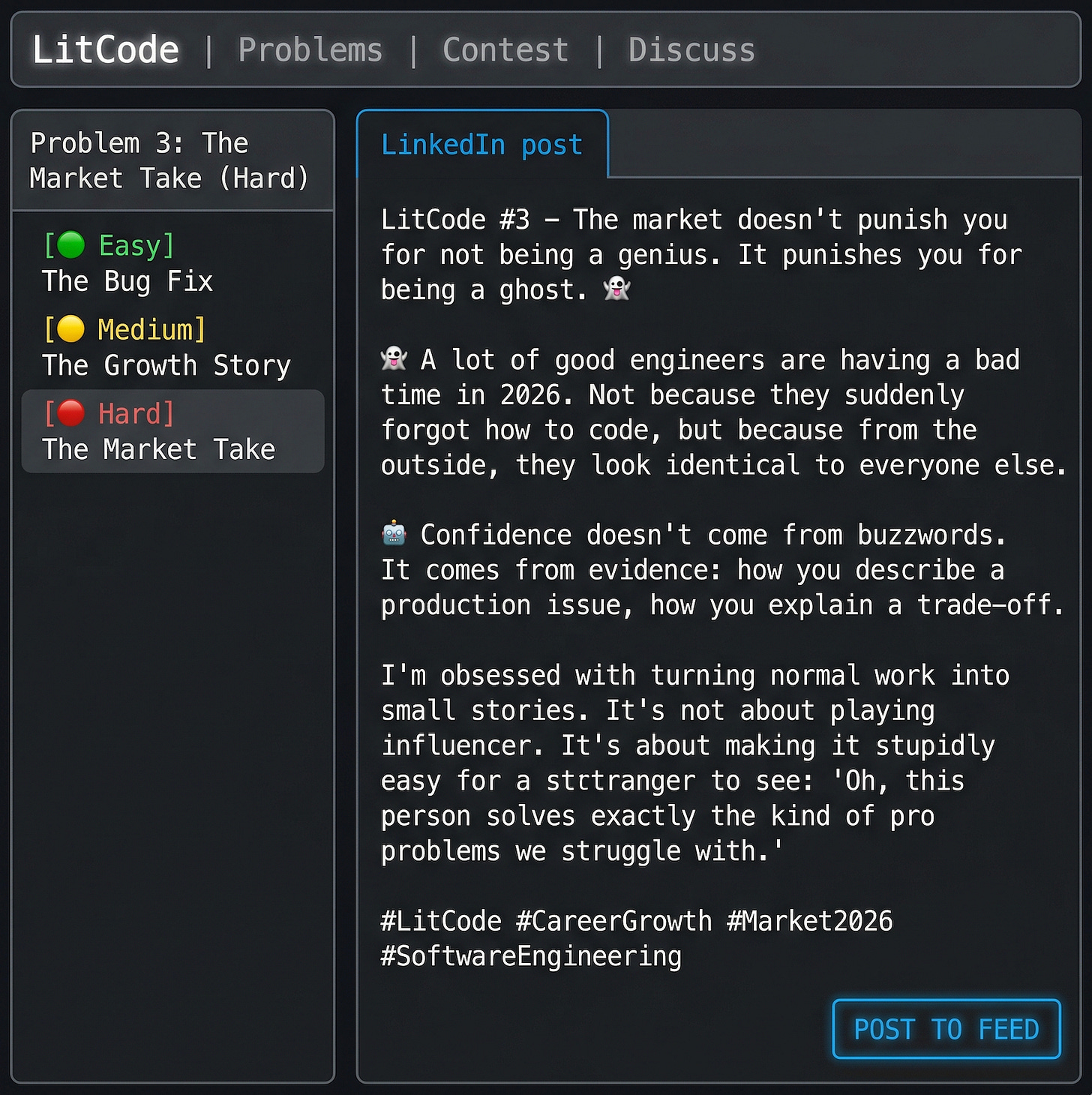 LitCode #3 â The market doesnât punish you for not being a genius. It punishes you for being a ghost.A lot of good engineers are having a bad time in 2026.