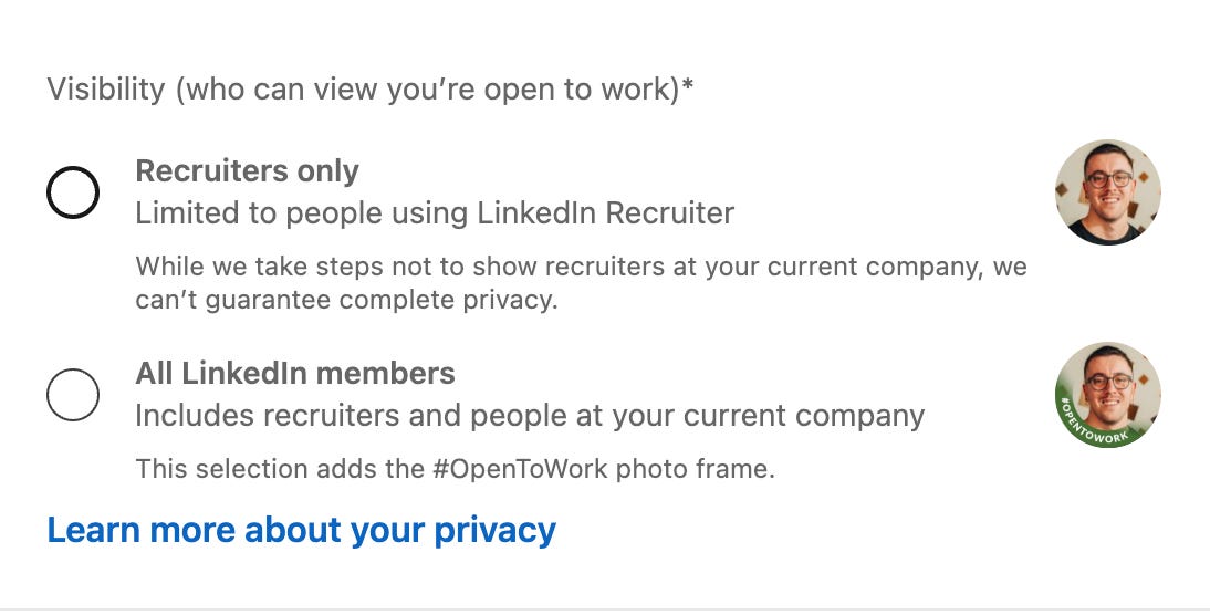 It’s true, if you opt for this badge, you can choose to show it only to people using LinkedIn Recruiter. But even LinkedIn says they can’t guarantee full privacy (also reiterated here), and honestly, nothing prevents recruiters from using other strategies, like using different accounts not linked to the company.