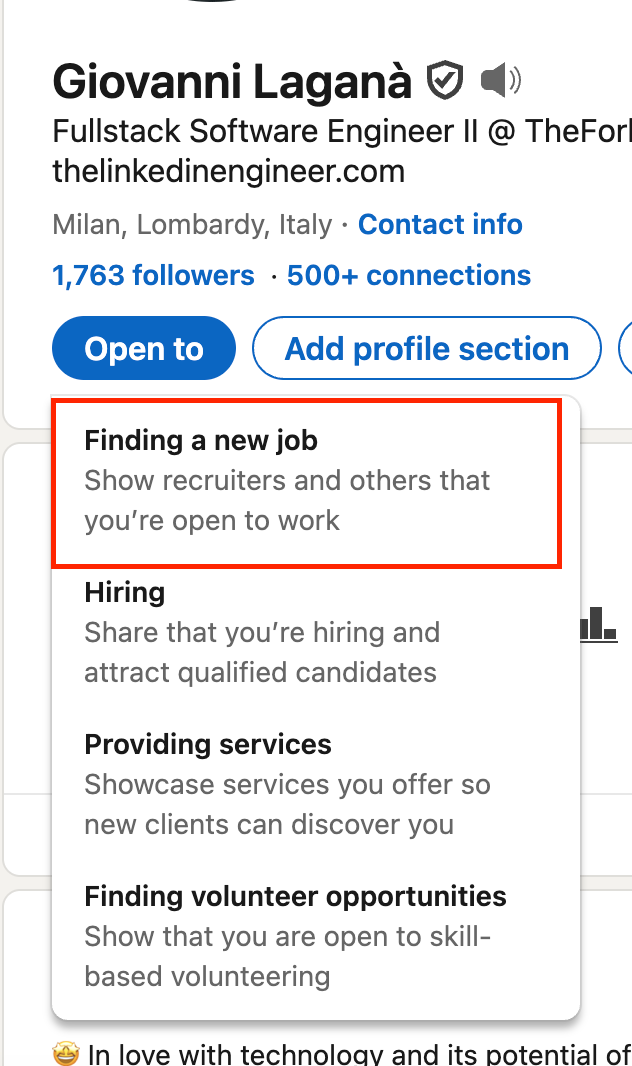 First of all, we can’t say that LinkedIn doesn’t push for its usage, since it’s accessible directly by clicking the “Open to” button — the very first one on your profile.