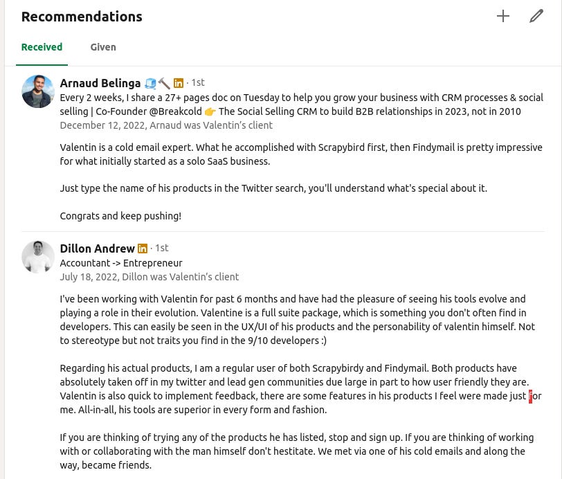 1️⃣ The keyword is balance: while it’s okay not to have received recommendations, you probably shouldn’t leave 100 recommendations if you haven’t received any. The reason is that it reduces their credibility, as people might think you are leaving them just to receive them in return.